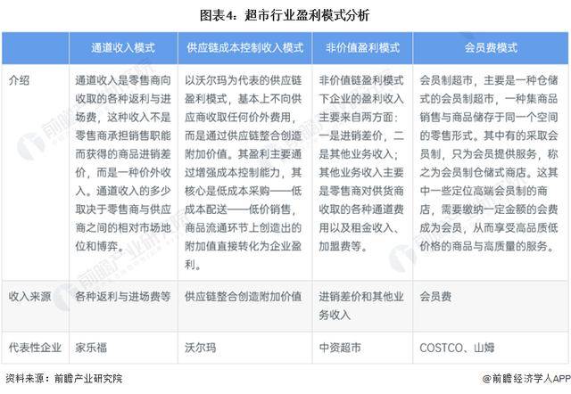 目前,超市行业主要盈利模式有通道收入模式、供应链成本控制收入模式、非价值盈利模式、会员费模式,代表企业家乐福、沃尔玛、中资超市、COSTCO等。