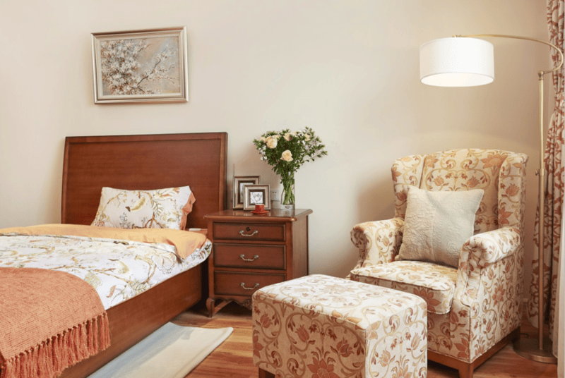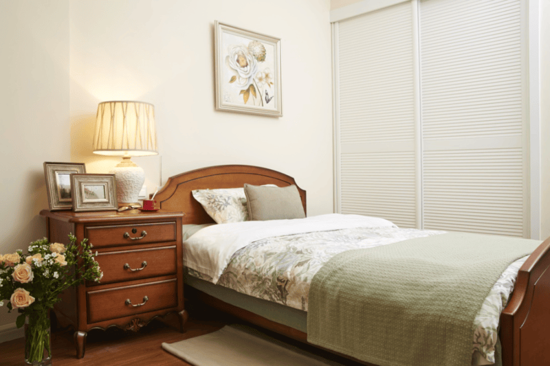 社区为每位(对)长辈提供独立生活空间,每个房间配备单独门锁,保障私密性,同时配置独立洗衣机、冰箱等家电,满足日常起居需求。空间设计全面贯彻适老化、无障碍理念,安装新风系统可有效去除PM2.5,保障室内空气质量;家具采用圆角设计,地面做防滑处理,卫生间配备扶手与助浴设施,全方位降低意外风险。软装布局融入“家”的温暖,纯实木家具、天然石材与地板环保健康,床品、软装选用高支棉材质,亲肤舒适;视觉专家定制温暖橙色与淡雅绿色配色,搭配柔和明亮的照明设计,避免强光刺激,营造温馨氛围。老物件摆设与留声机流淌的音乐,唤醒长辈青春记忆,让居住更有温度。