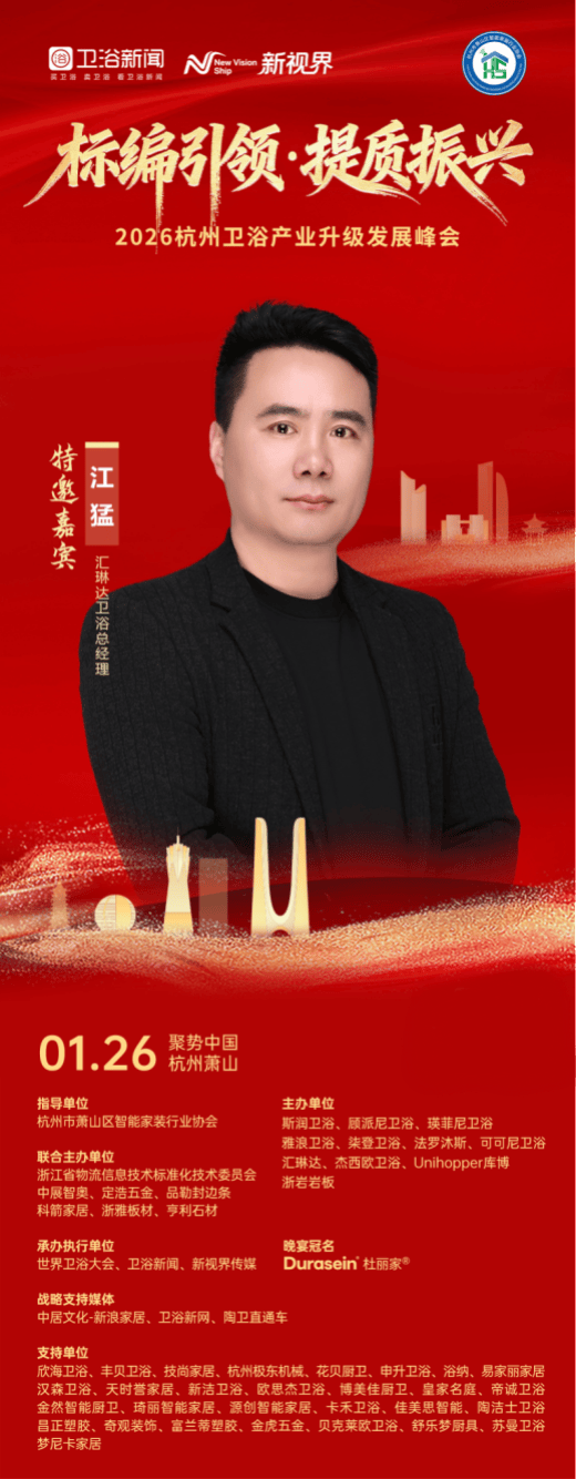 匠心铸品,领航前行;聚力同心,共启新程。2026年1月26日,以“标编引领·提质振兴”为主题的2026杭州卫浴产业升级发展峰会将在萧山盛大启幕。作为杭州卫浴产区领军企业、本次大会联合主办单位,汇琳达卫浴——杭州百耀厨卫有限公司旗下专注于高端实木浴室柜的核心品牌,携“创新设计、严苛质量、诚信服务”的核心积淀,与全行业同仁共探产区高质量发展新路径,以联合主办的责任担当,赋能杭州卫浴产业从“规模优势”向“品质优势”跨越,助力“浙造卫浴”品牌价值升级。
