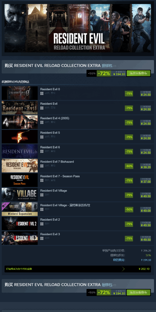 另外值得一提的是,此前我们曾报道,至此春节假期期间,卡普空也在Steam上开启了发行商特卖活动。其中,收录了《生化危机》系列从0代至8代共9款正统作品(不含《生化危机4:重制版》)的《生化危机:重装上阵额外合集》也开启了限时特卖,活动期间打包带走仅需不到200元。感兴趣的玩家千万不要错过。